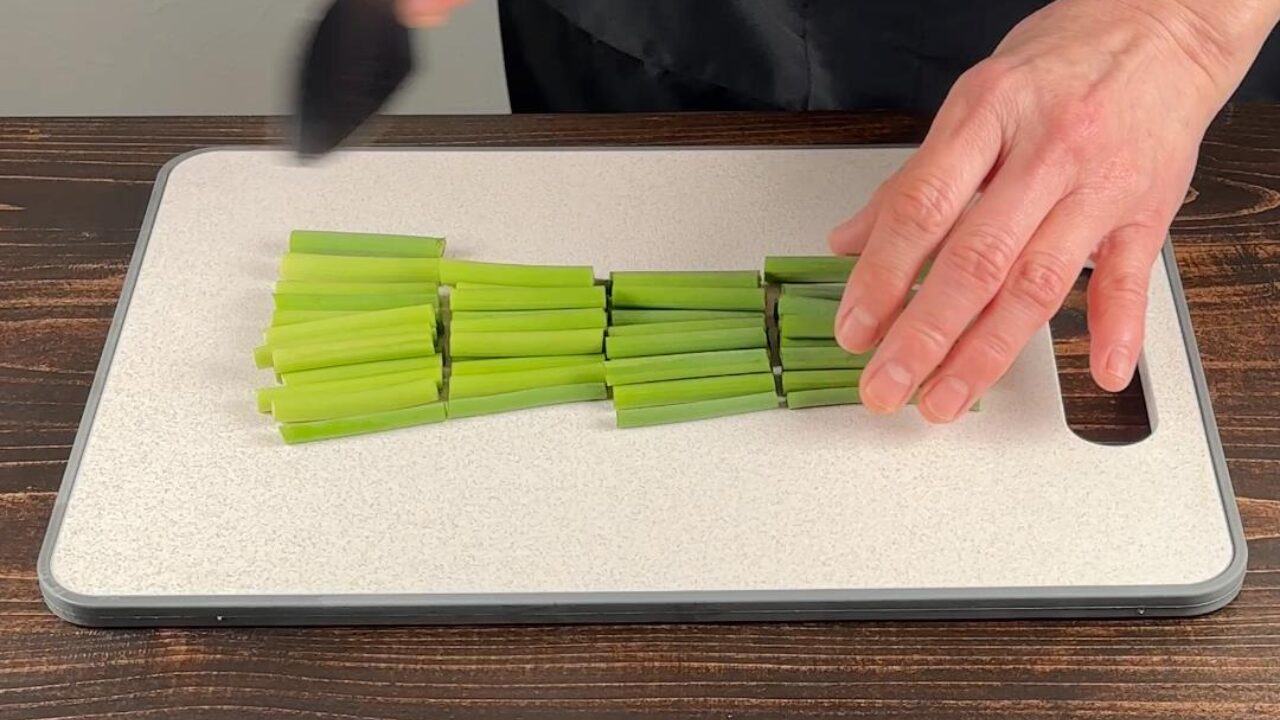 ニンニクの芽を洗い、5㎝幅に切ります。