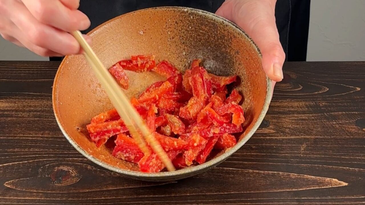 パプリカを混ぜ合わせた調味料で和えます。