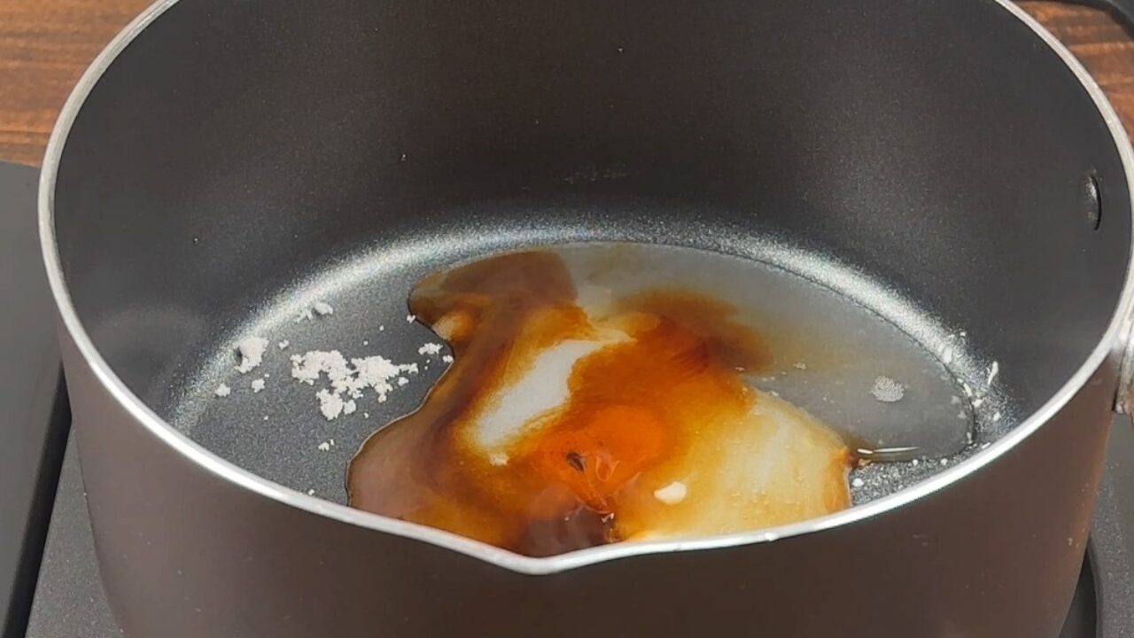 鍋に砂糖、片栗粉、酒、みりん、醤油、水(小さじ1)、酢、ラー油を入れて混ぜ、弱火にかけます。