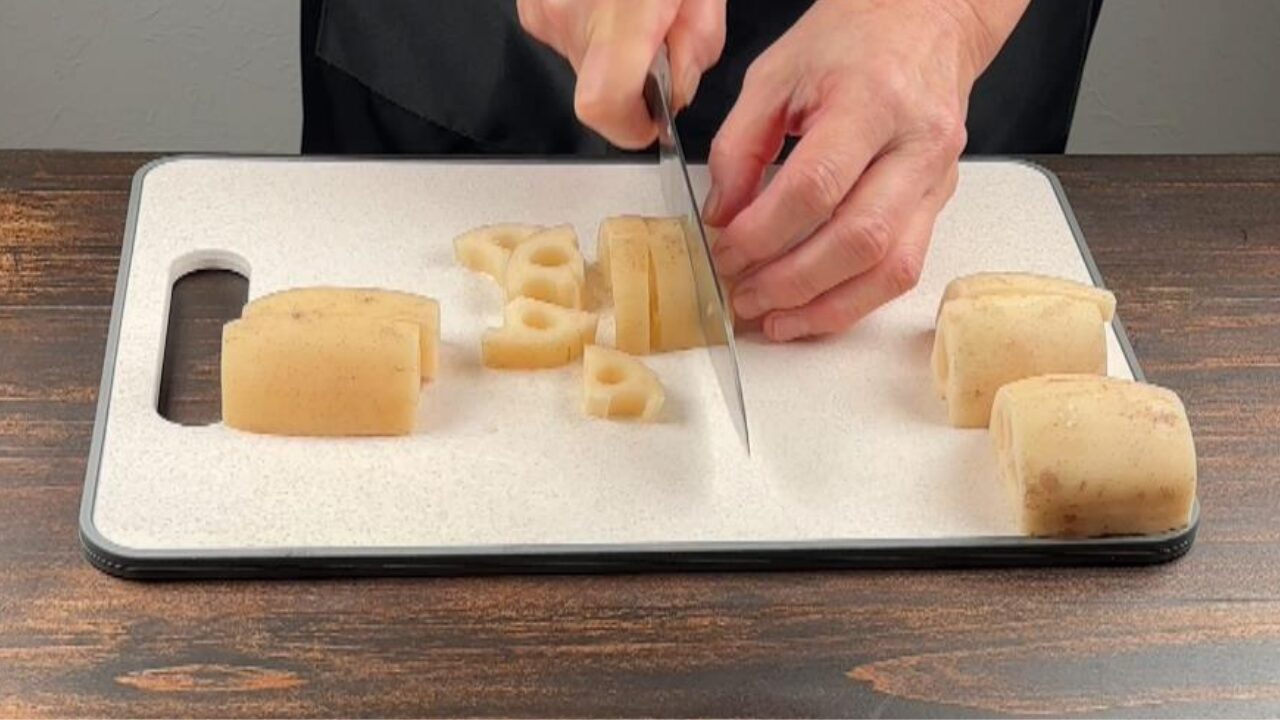 レンコンは良く洗い、厚さ1㎝のイチョウ切りにします。