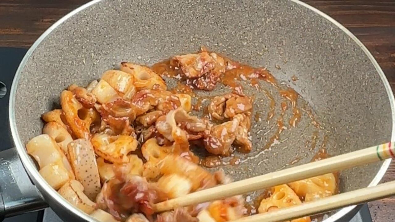 レンコンにおいしそうな焼き色がついたら火を止め、みりんで溶いた味噌を入れて余熱でからめます。