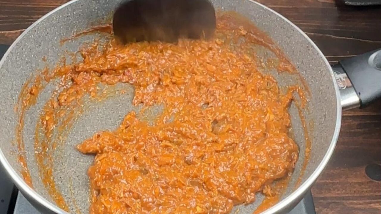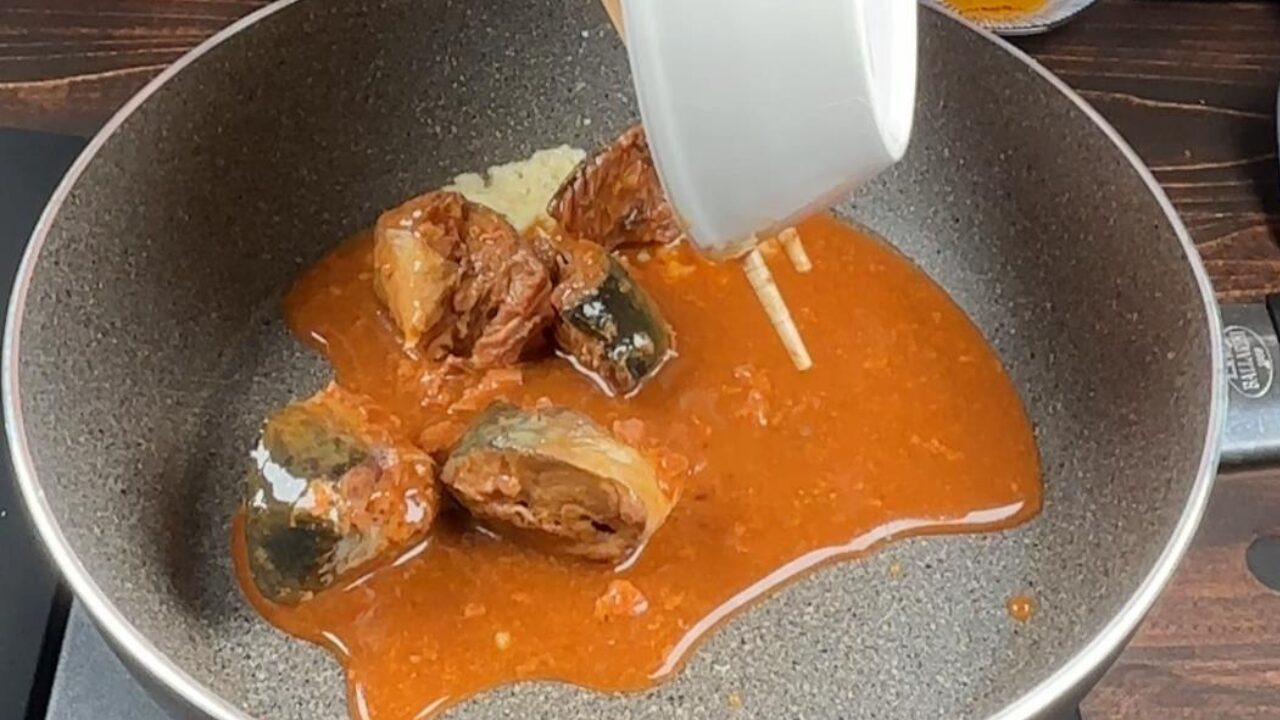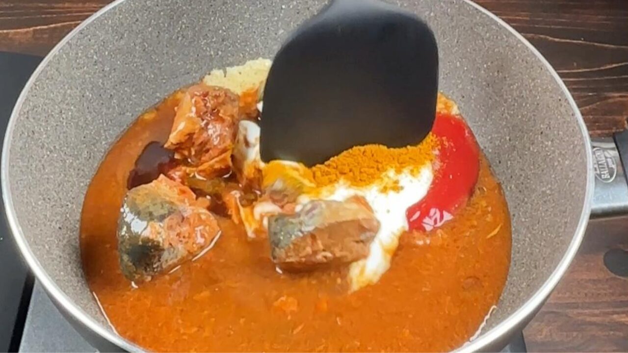 トマトケチャップ、ソース、ヨーグルト、醤油、カレー粉を入れ、サバをヘラで押えてほぐしながら、煮詰めます。