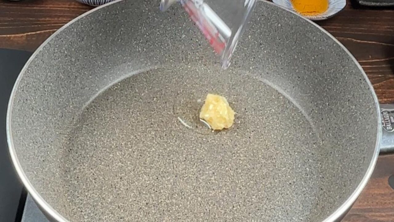 フライパンにサラダ油とおろしショウガ、おろしニンニクを入れ、弱火で熱します。