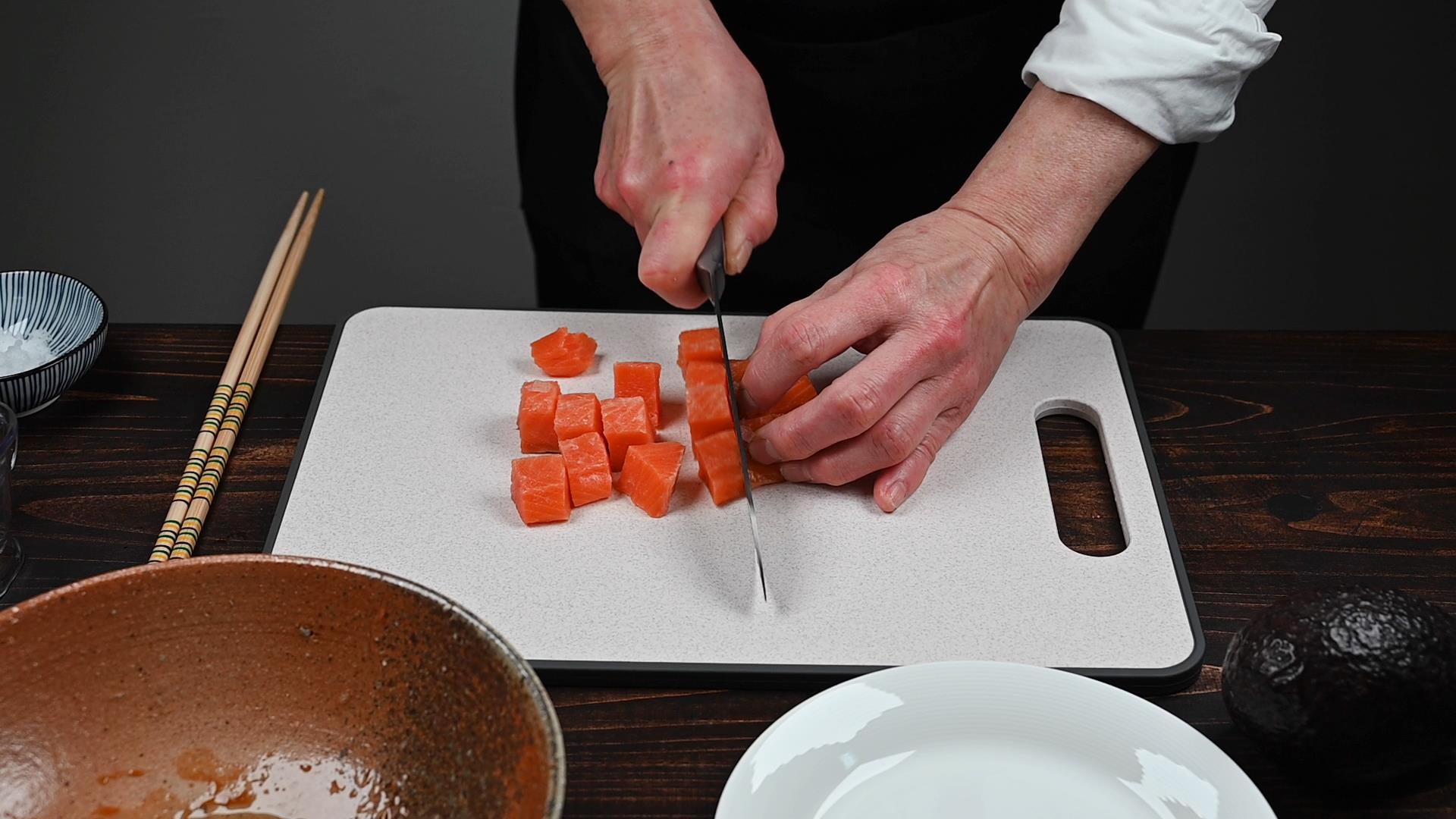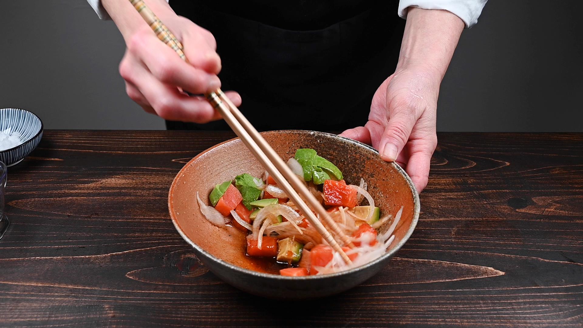 玉ねぎとサーモン、アボカドも入れて混ぜ、ラップをして冷蔵庫で15分なじませます。
