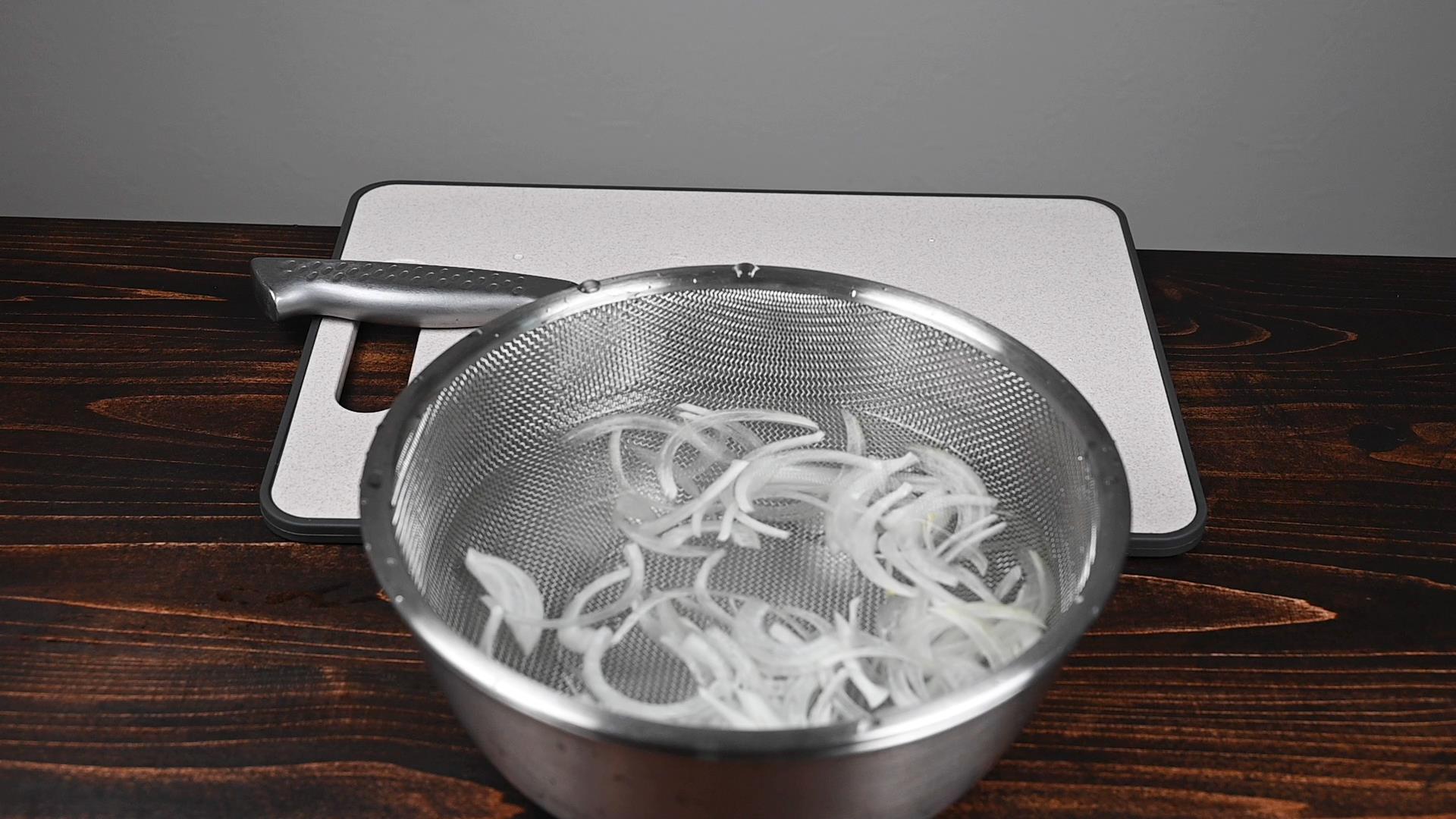 10分さらしたらザルに上げて水を切り、残った水気をキッチンタオルで吸い取ります。