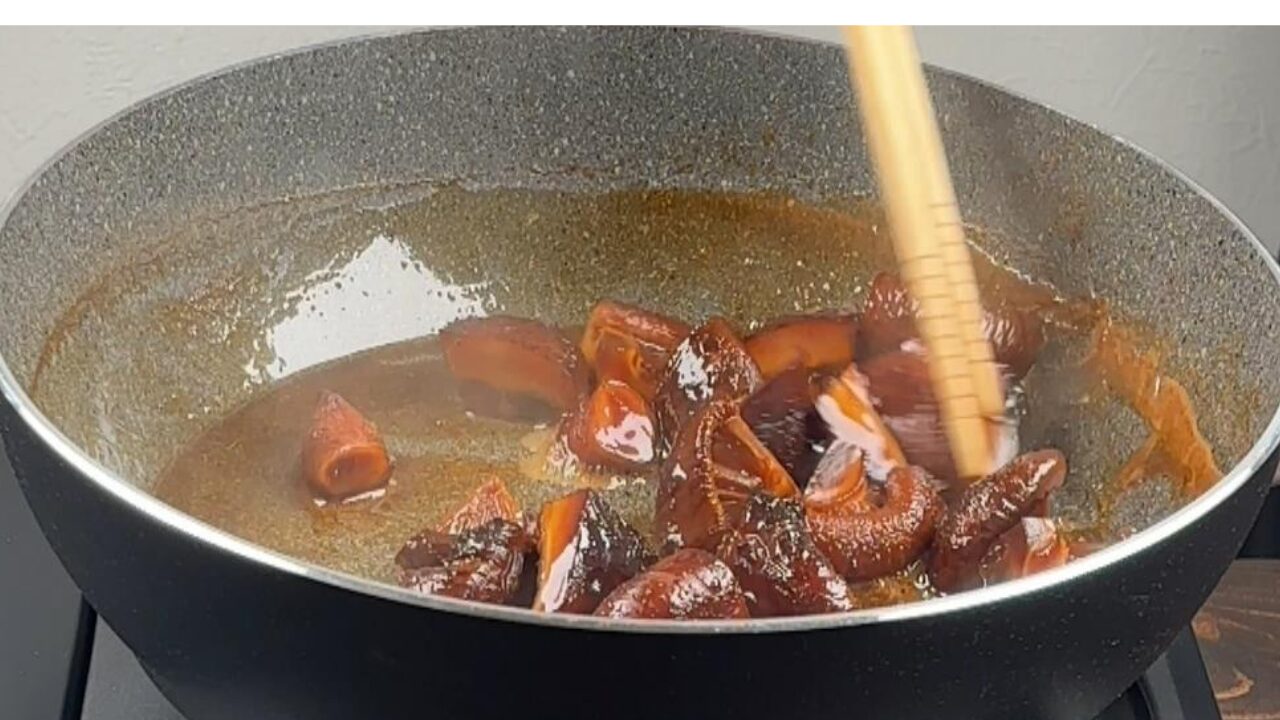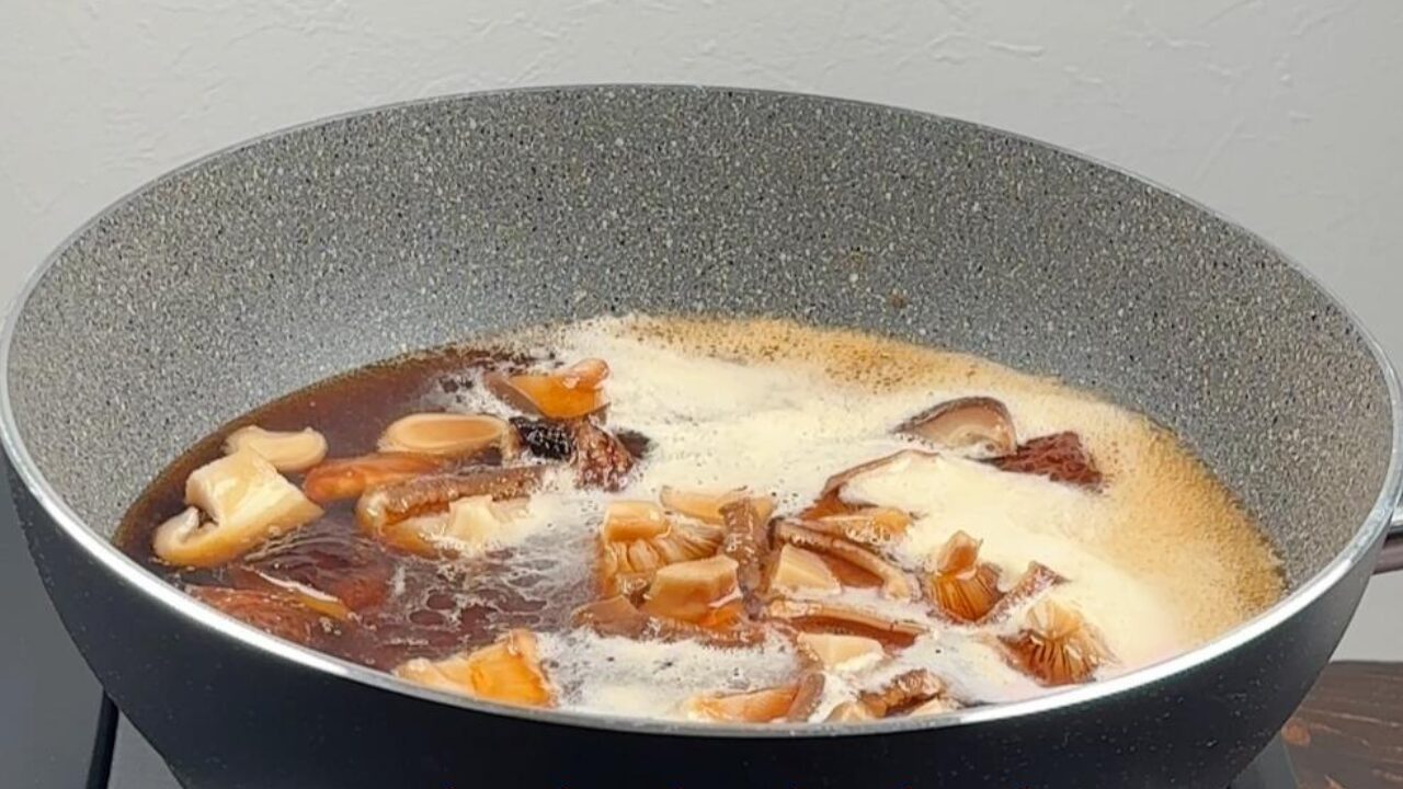 鍋に戻し汁と調味料、シイタケを入れて煮詰めます。