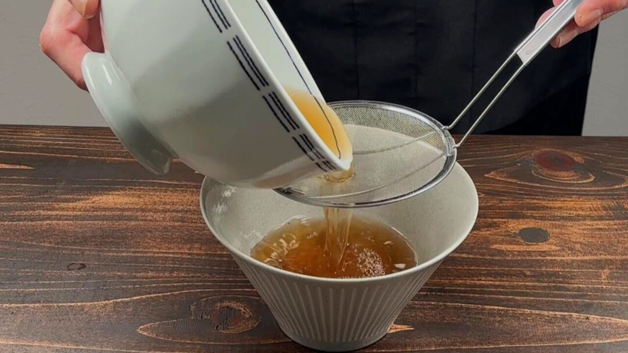 戻し汁の底に沈殿している細かいカスを茶こし等でこします。