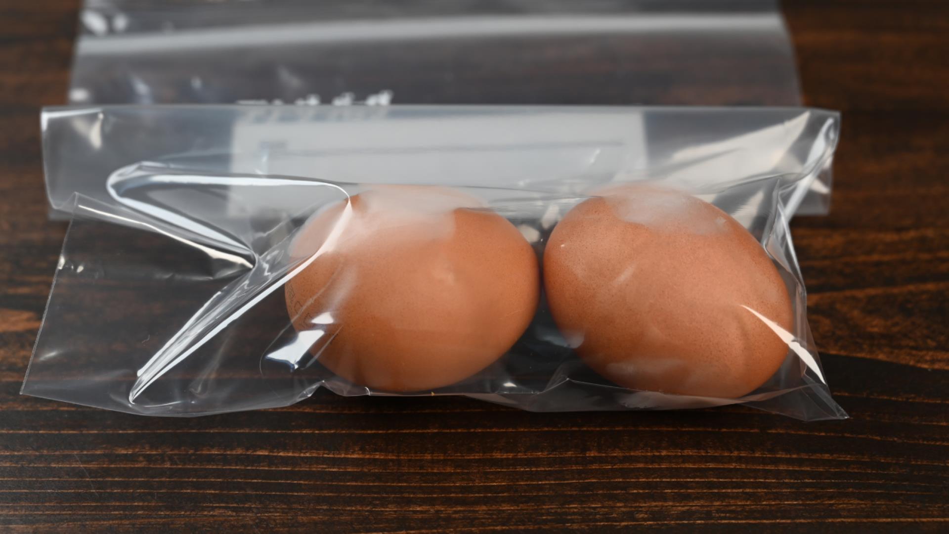 新鮮な卵を殻ごと冷凍保存袋に入れ、しっかり凍るまで冷凍します。