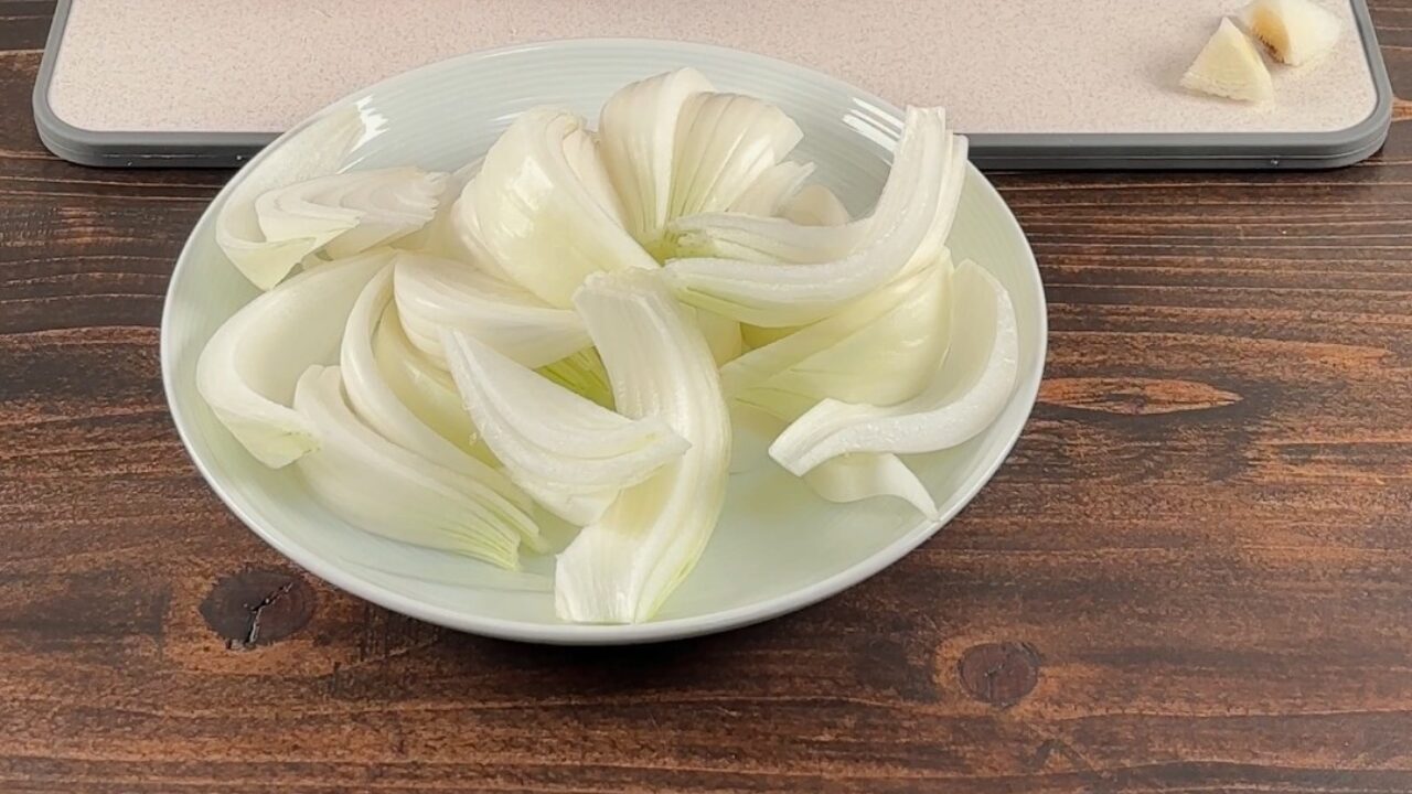 新玉ネギはくし形に切り、皿の上にひろげて15分ほど空気にさらし、辛味をやわらげます。
