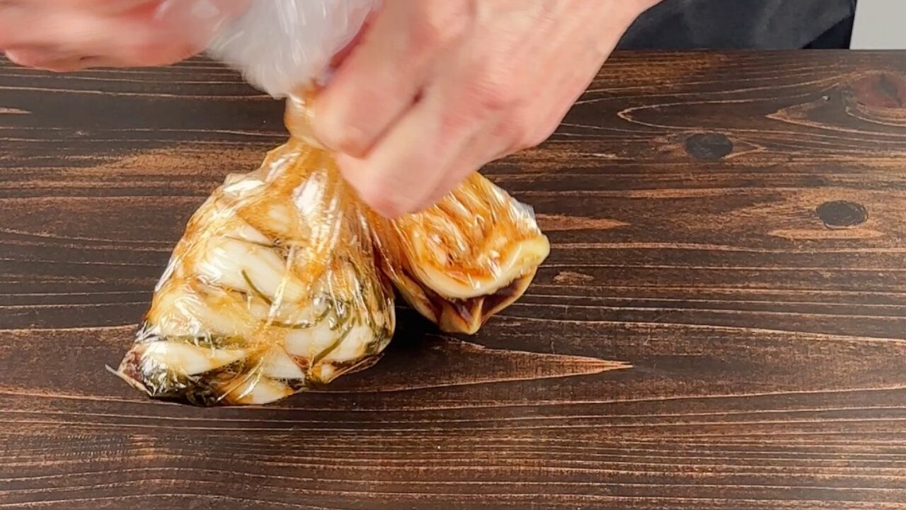 袋の空気を抜いて口を閉じ、冷蔵庫で4時間漬けます。