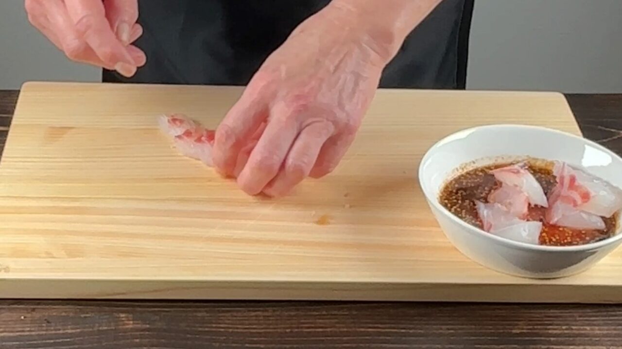鯛の刺身をそぎ切りにして入れ、冷蔵庫に10分おきます。