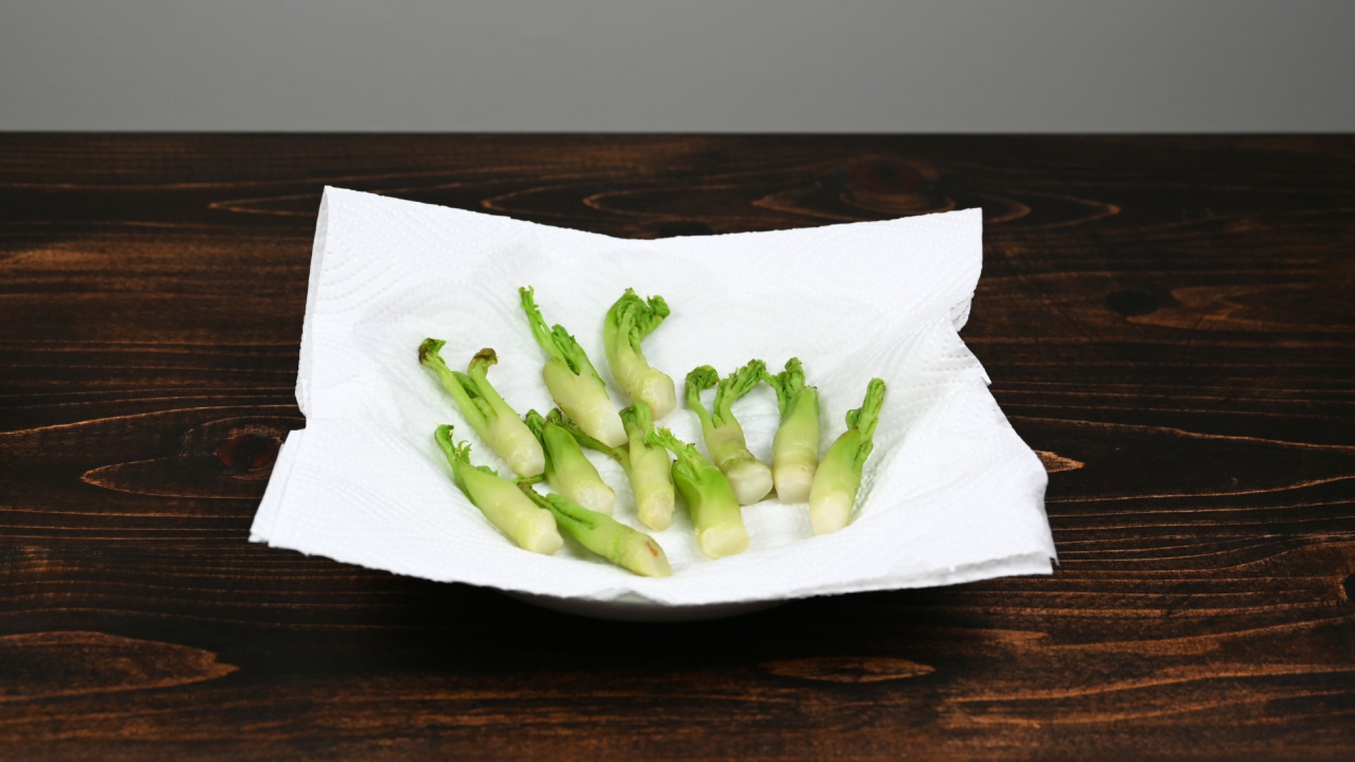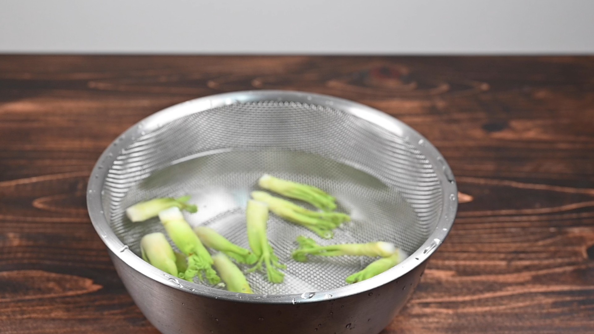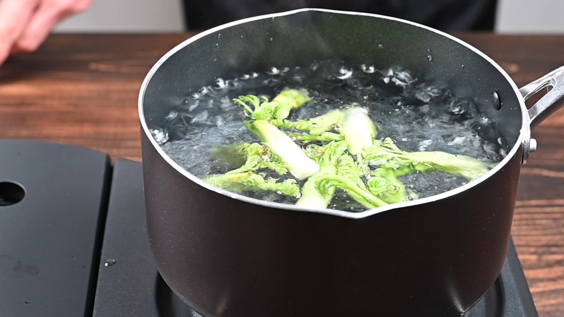 鍋に湯を沸かして塩を入れ、タラの芽をゆでます。