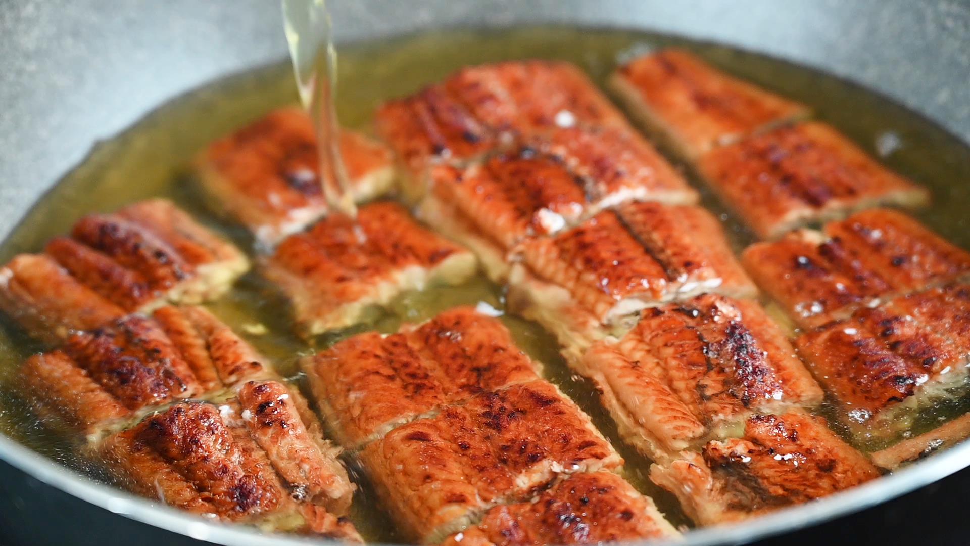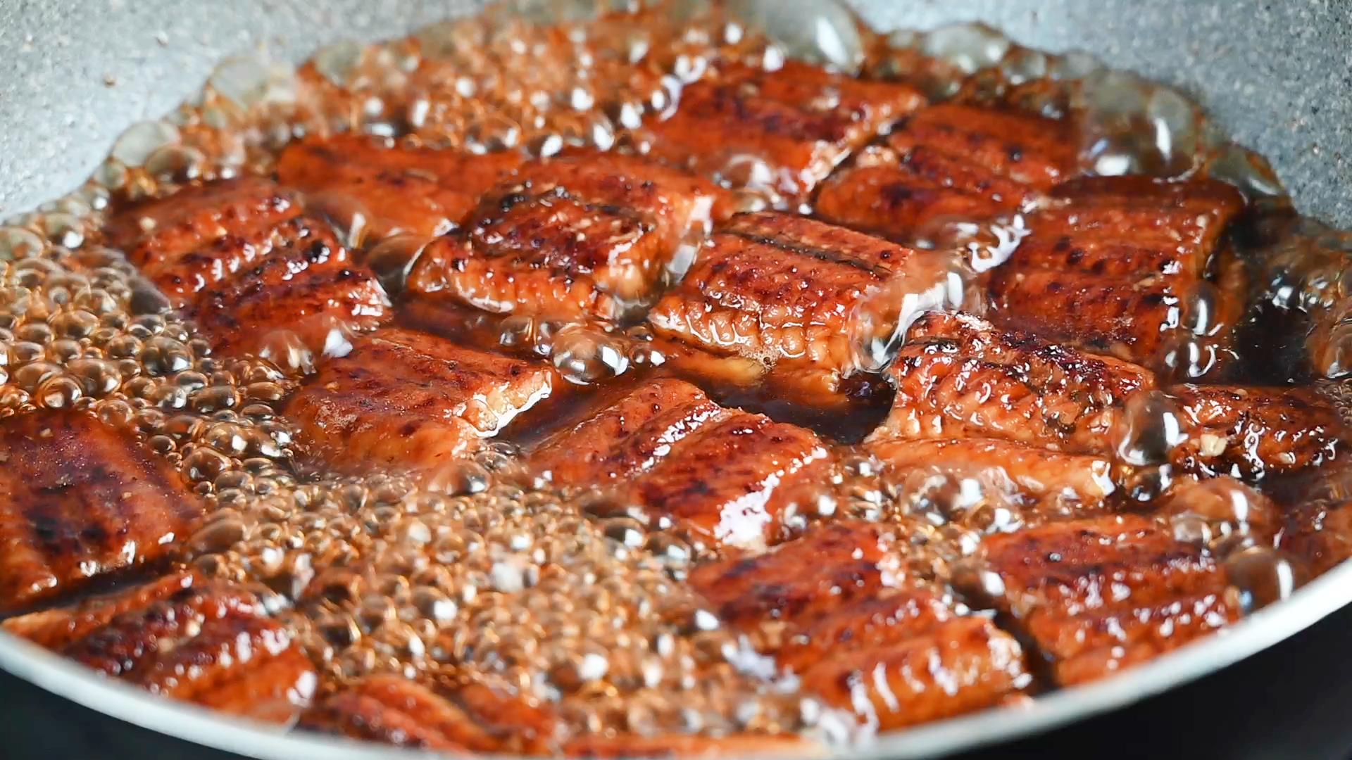 フライパンにウナギをならべ、お茶を入れて強火にかけます。